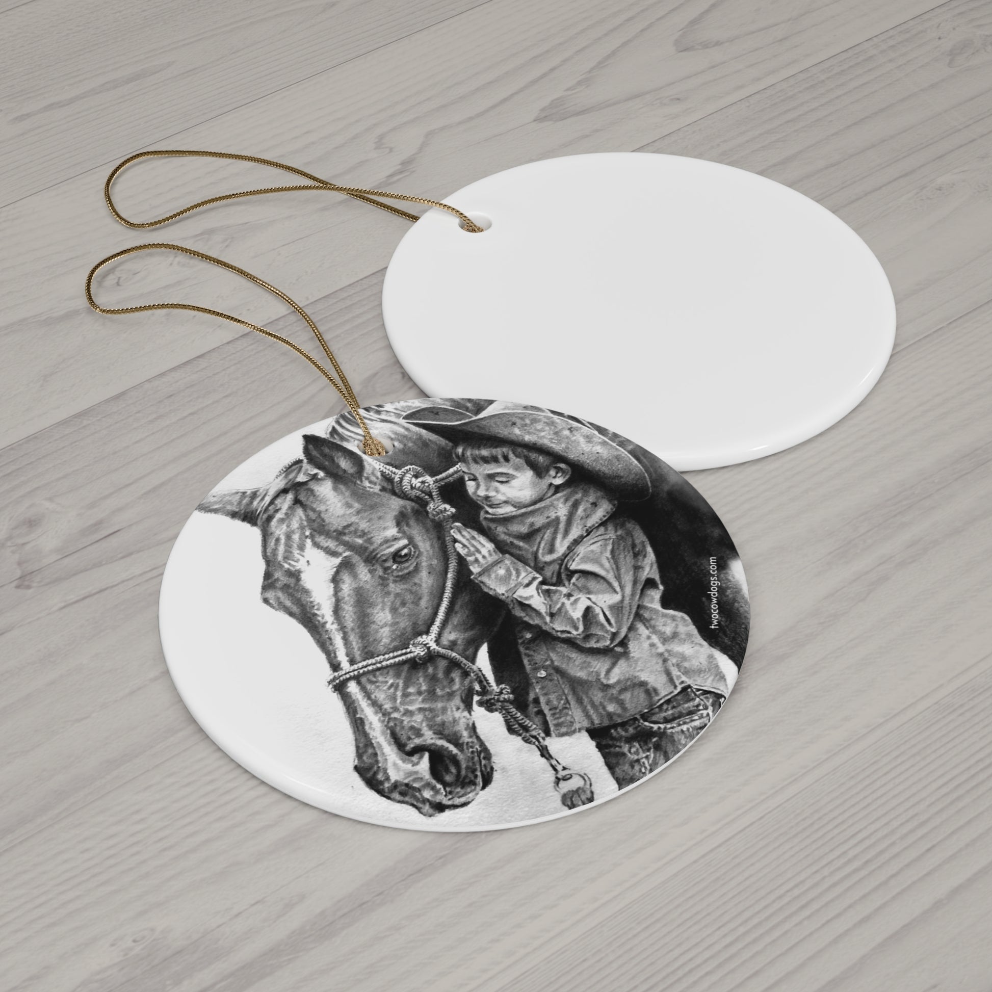 A small, wistful keepsake that brings the ranch into quiet holiday corners. Hand-drawn in soft pencil, the sketch shows a young cowboy with his hand on a patient horse — a calm, dust-sweet moment of trust and childhood evenings spent around the barn. Lightweight ceramic with a glossy sheen, it catches Christmas lights and adds gentle cowboy charm to stockings and trees. The simple silhouette and single-sided print let the drawing breathe, while the gold-toned hanging string and sturdy one-piece construction make it ready to hang and pass along as a memory of horses, dirt roads, and slow afternoons at the corral.