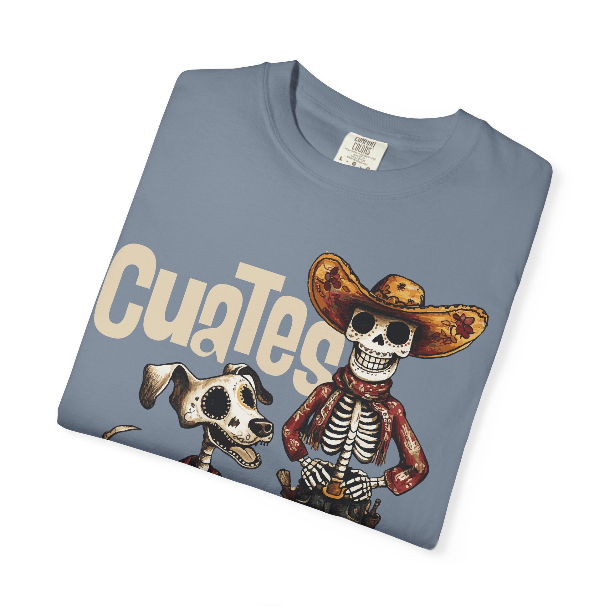 Down on the dusty trail, some bonds go deeper than life itself. Cuates — Spanish for “buddies” — celebrates the unbreakable friendship between a cowboy and his loyal dog, even beyond the grave. Dressed in full rodeo regalia and rendered in rich, vintage tones of saddle brown, bone white, and faded red, this design brings a Day of the Dead twist to classic Western style.