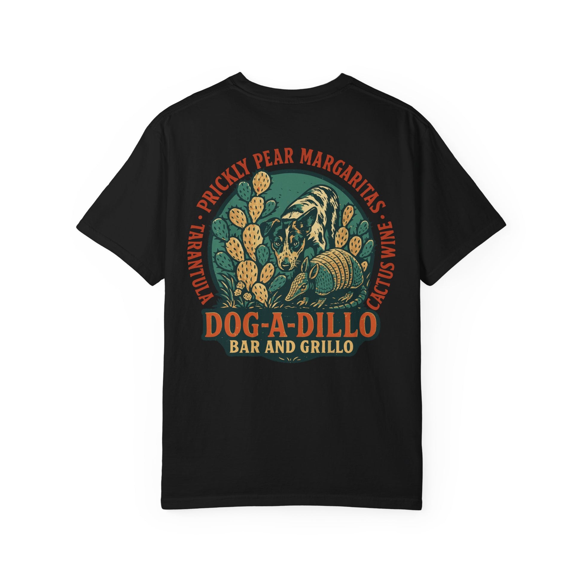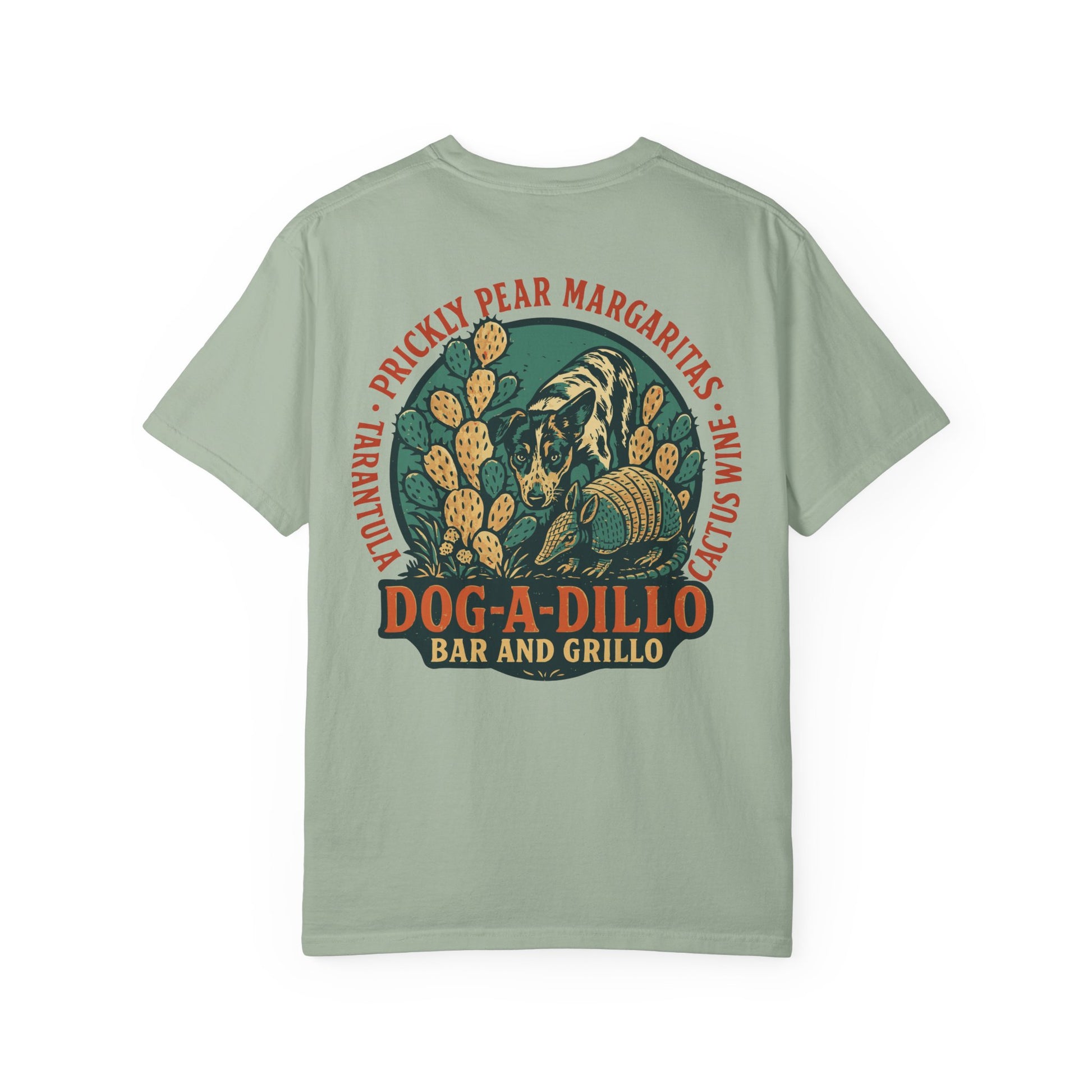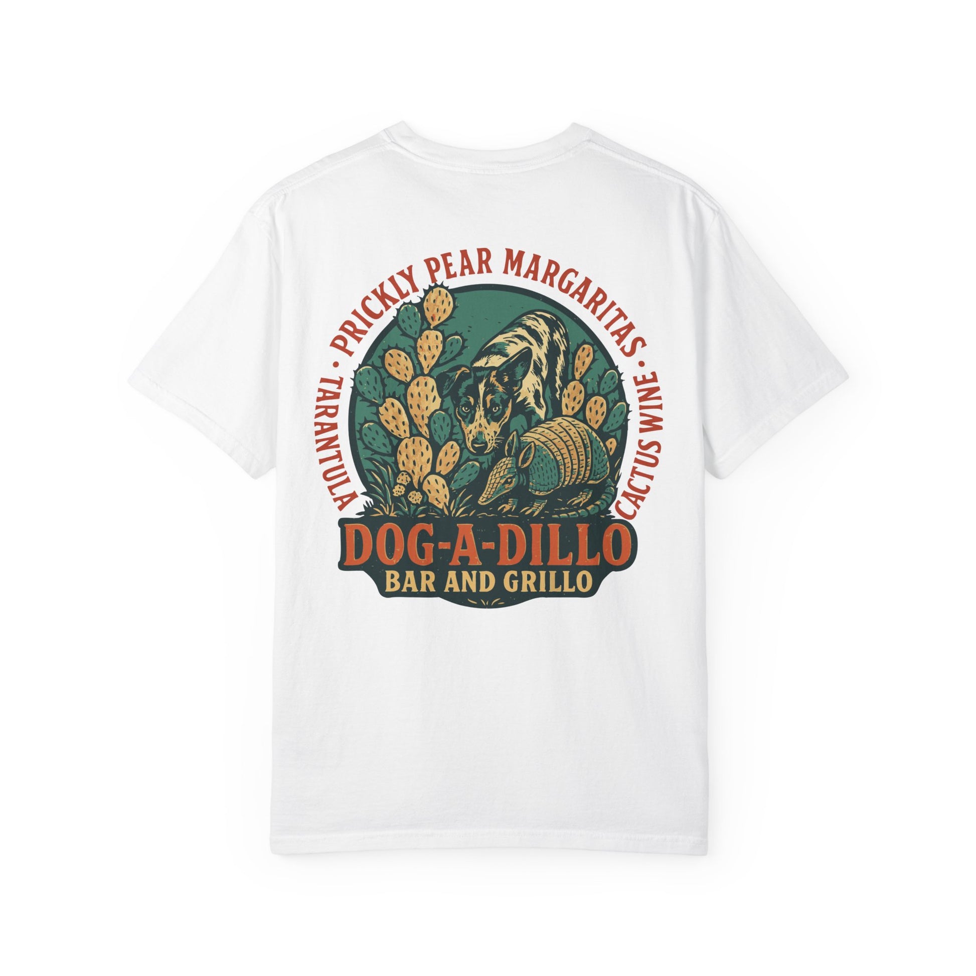 Where the mesquite smoke’s thick, the margaritas come with cactus spines, and the cowdogs run the joint — welcome to the Dog-A-Dillo Bar and Grillo. This tee captures that desert-side dive you wish really existed, complete with a curious cowdog, a tipsy armadillo, and a patch of prickly pear ready for happy hour.