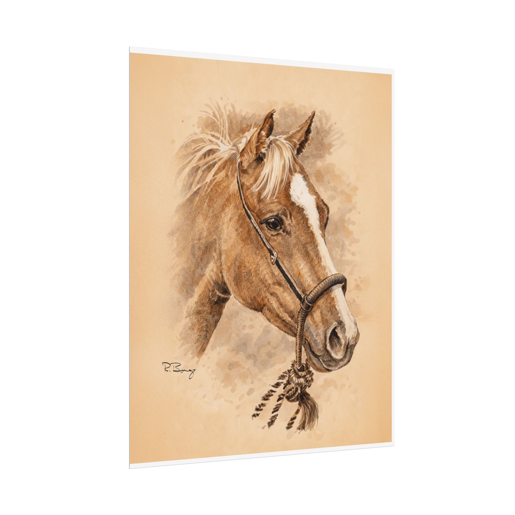 This rolled poster quietly celebrates a working horse and the slow, steady partnership that comes from time in the saddle. Rendered in sun-bleached browns and soft watercolor washes with loose pencil lines, the image captures a calm, attentive horse—mecate and bosal in place, ears forward, ready when asked. The artwork feels weathered and honest: no flash, no hurry, just balance and trust built the old way. Hang it in a tack room, study, or living space to bring a touched-by-saddle warmth and a reminder of steady hands and patient miles.