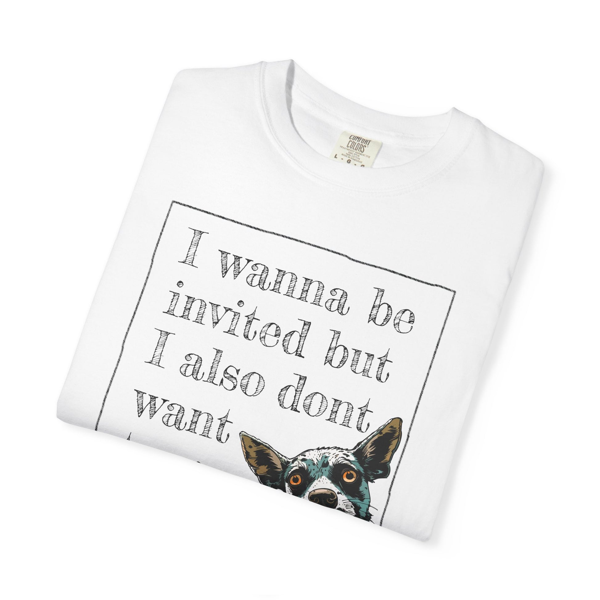 Quiet, wry, and a little guilty of loving the couch — this tee says what you’re feeling without you having to say a word. A hand-drawn cowdog peers up with a “I’ll come…maybe” look, printed in rustic, lightly distressed ink like someone doodled it on the barn wall. The garment-dyed cotton has a lived-in softness that settles into your rotation fast. Wear it to small gatherings, backyard hangs, or those rare public outings when you want your shirt to carry the small-talk for you. It fits the slow-smile introvert who prefers a cozy evening over a crowd, and the homebody who wants clothes that match their low-key humor.