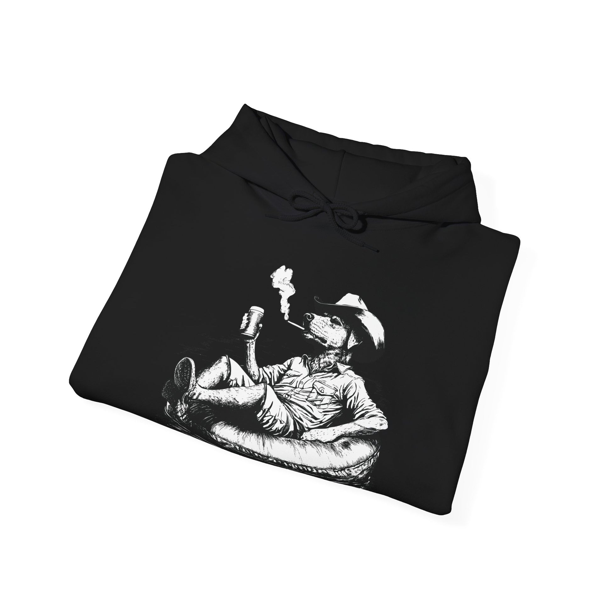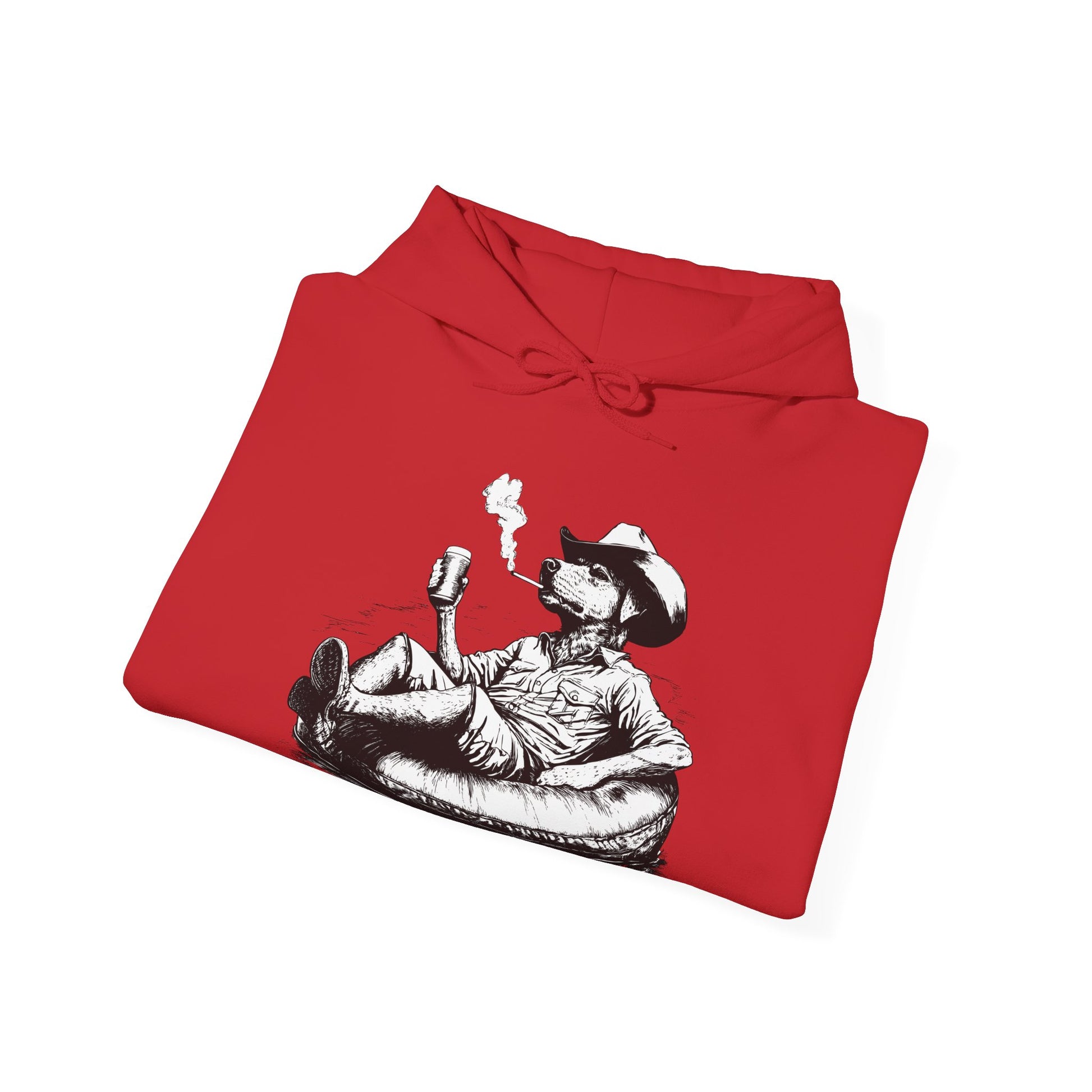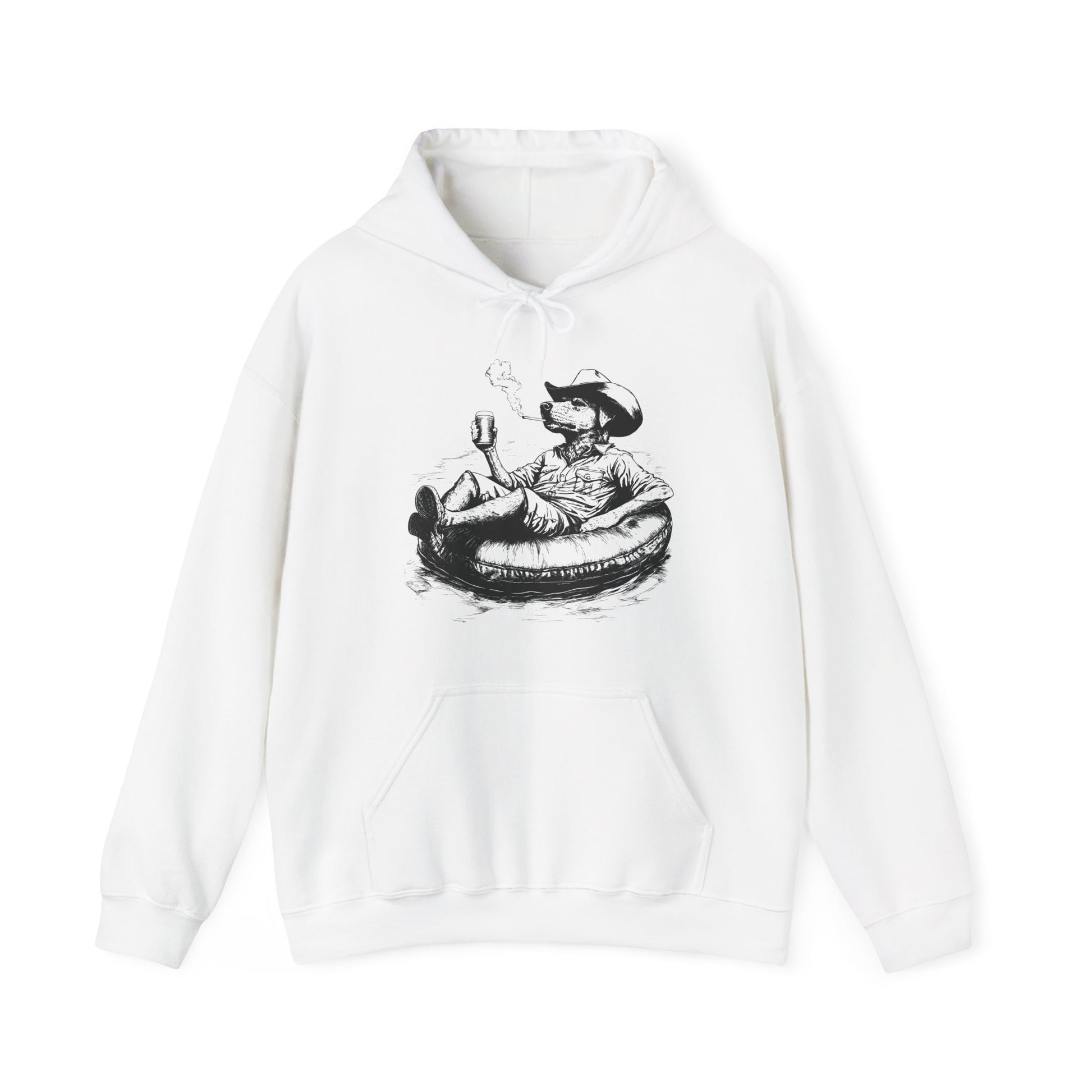 Kick back with the king of doing absolutely nothing. This hoodie features a laid-back cowdog floating the river in an old inner tube — boots up, cowboy hat tipped low, coffee in hand, smoke drifting off into the summer heat.