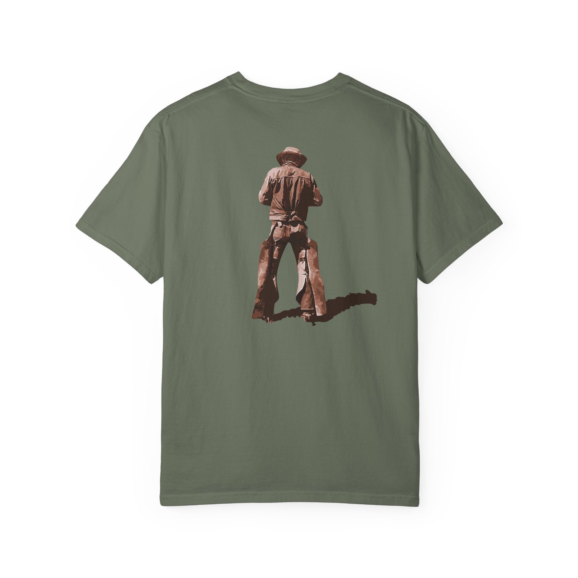 A clean, quiet Western, The Lone Drifter Tee features a cowboy seen from behind — worn chaps, dusty boots, and that timeless stance that only comes from long days under open sky. Printed on a soft, comfortable tee perfect for everyday wear.