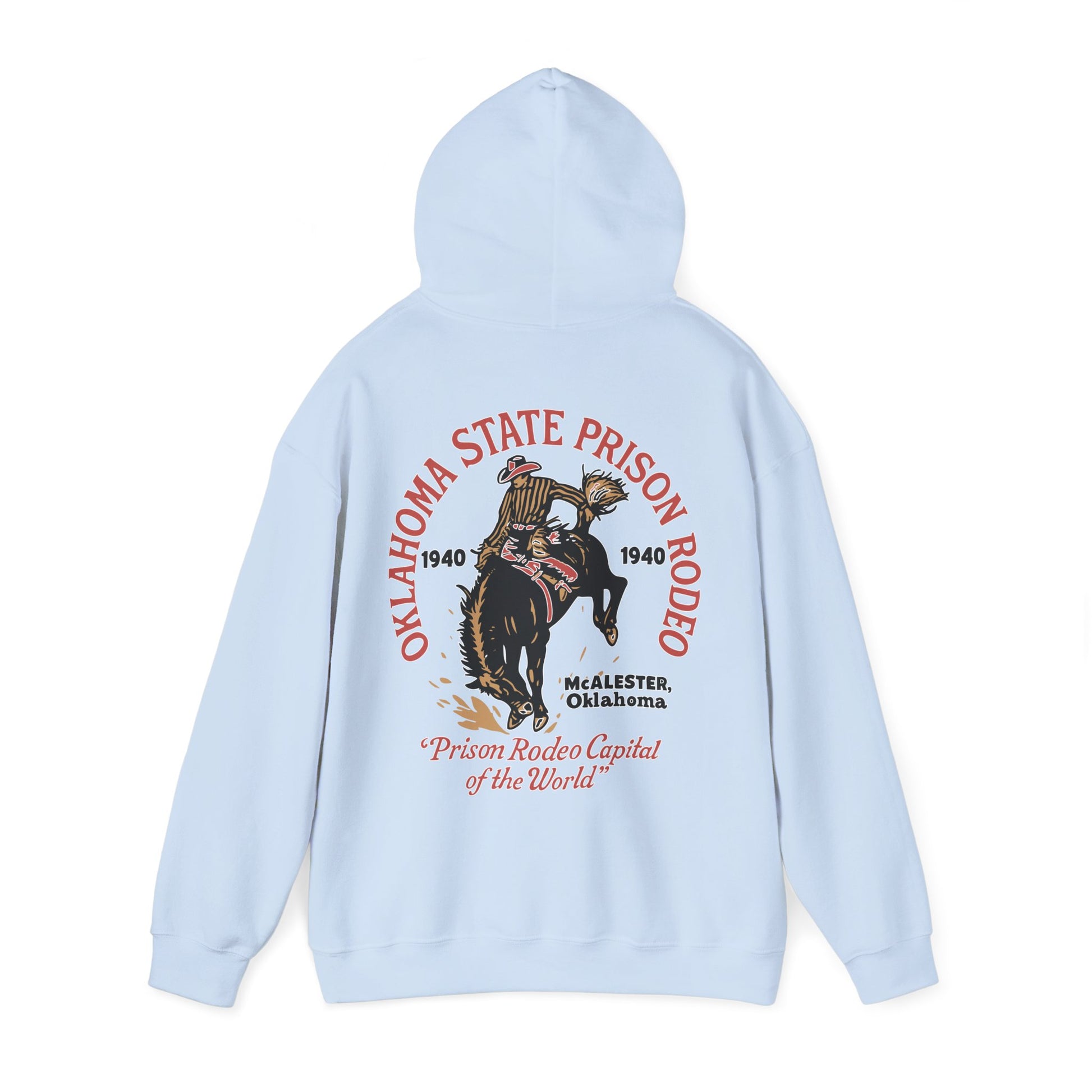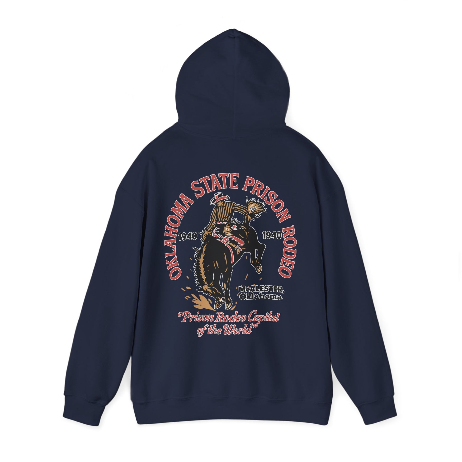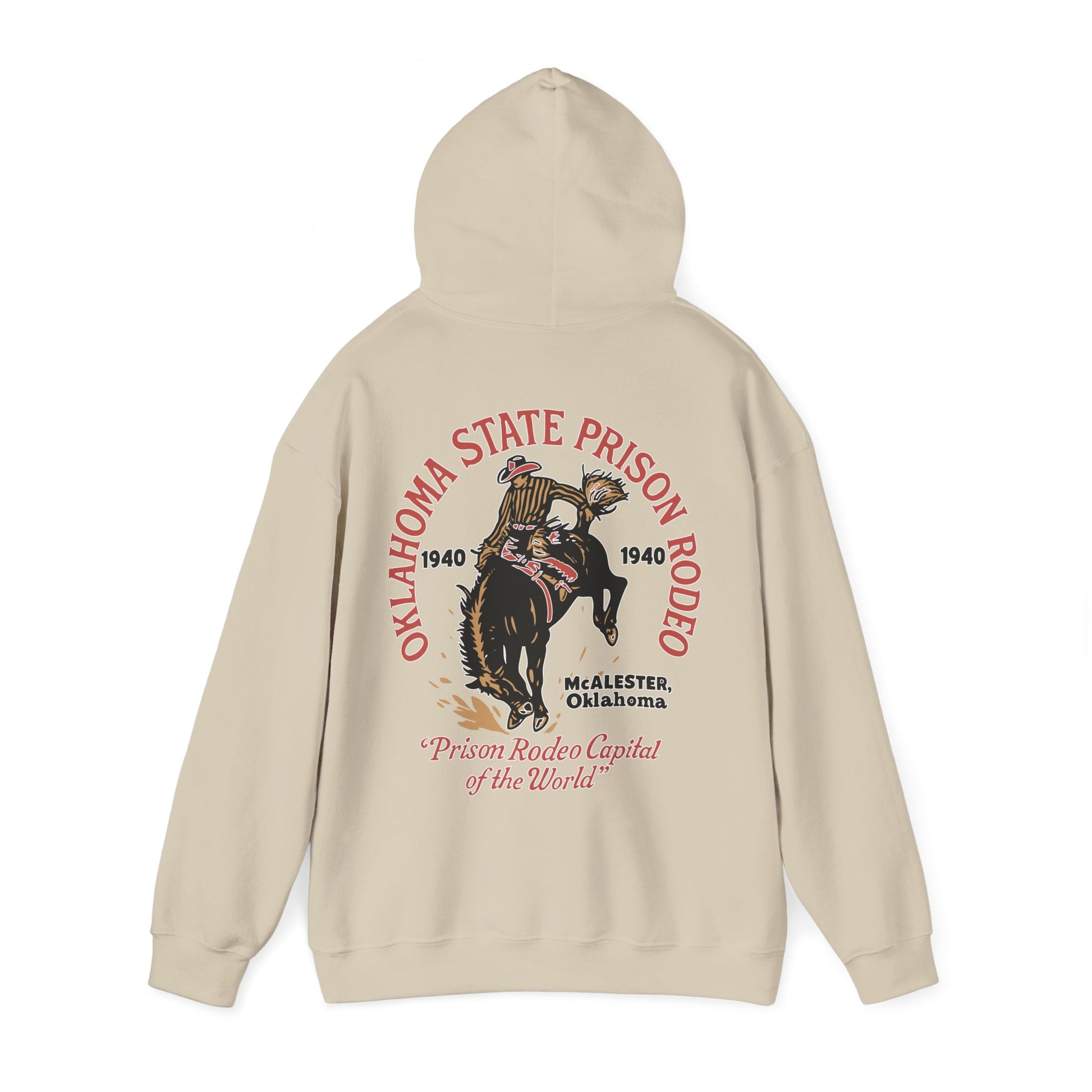 Revive the legend of the Oklahoma State Prison Rodeo with this vintage 1940s rodeo-poster style Hoodie. Bold retro print on soft cotton with a distressed ink look. Perfect for those who believe in second chances, bad ideas, and a good ride. Ideal for rodeo enthusiasts and those who appreciate vintage styles. Relevant for rodeo season, western-themed parties, and cowboy celebrations.