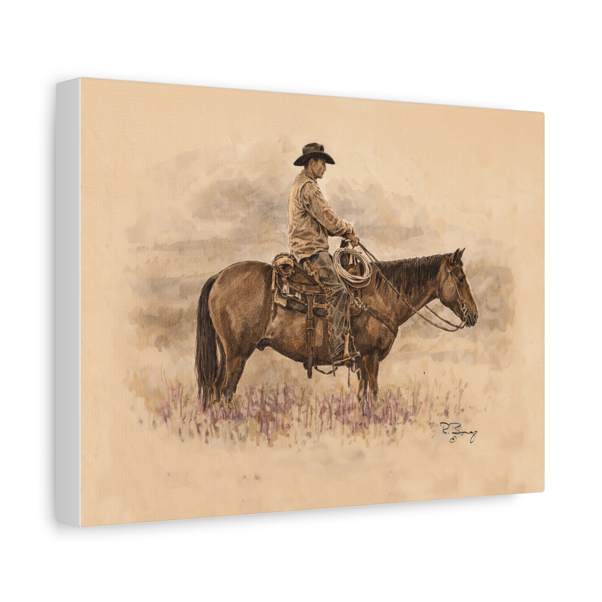 This stretched matte canvas captures a quiet ranch moment — a cowboy settled in the saddle, horse and rider moving together through dust and light. The pencil lines and watercolor washes keep the piece honest: texture in the grass, soft washes in the sky, and sun-worn tones that speak of long days outside. Hung on a wall, it brings a slow, steady atmosphere to a room — the patience of ranch life, the readiness of partnership, the calm between motions. The muted browns, grays, and tans let the drawing breathe, inviting long looks and a gentle reminder of landscapes that shape character.