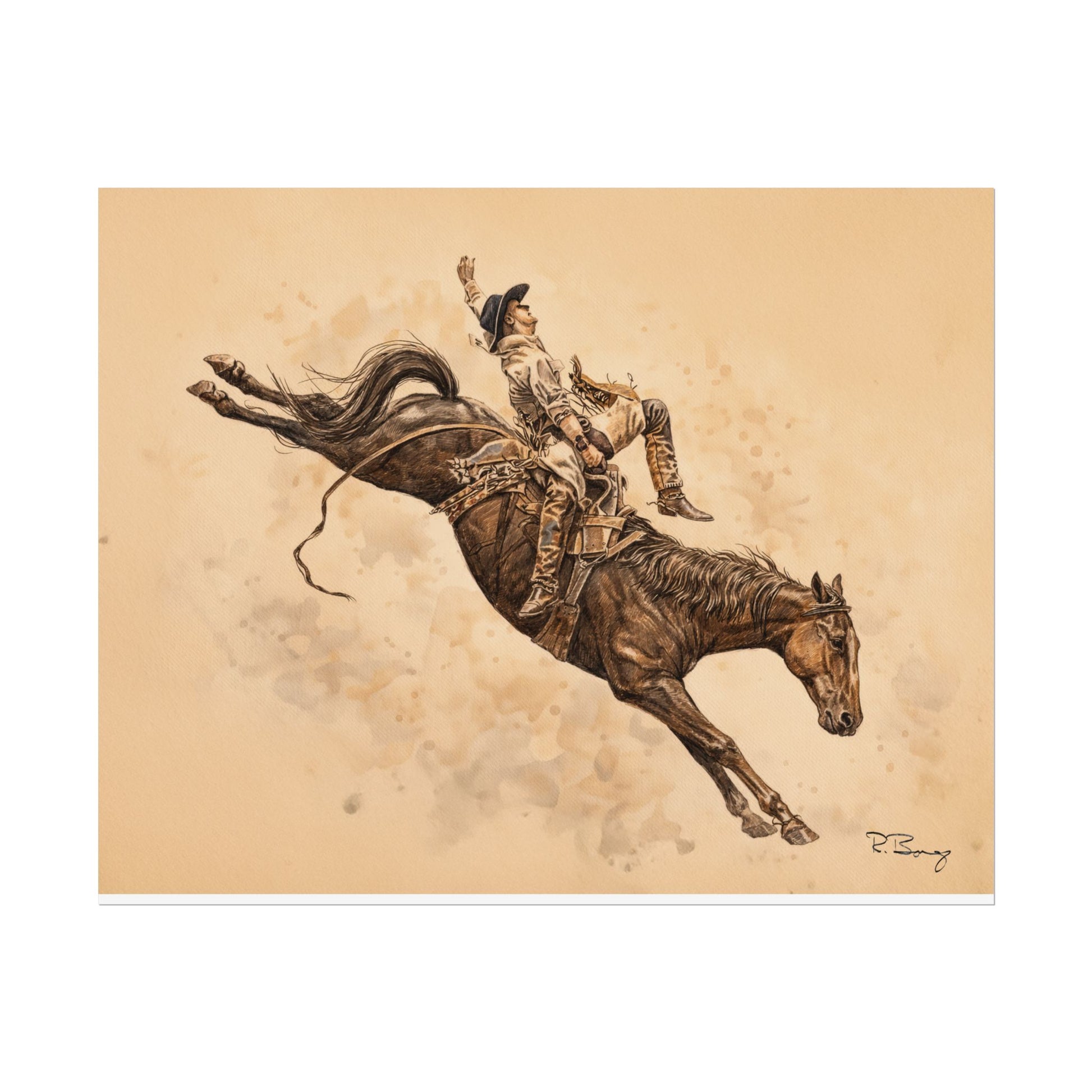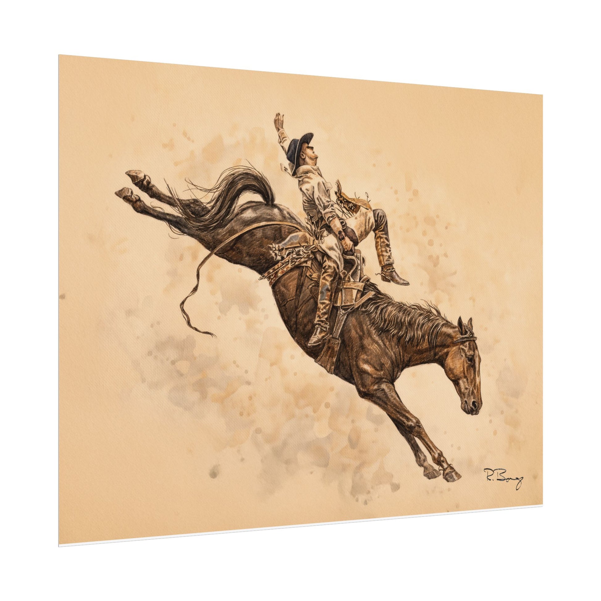 A bronc stretched long and wild, every muscle firing, while the rider leans back on instinct and nerve alone — one hand up, one hand trusting leather, gravity, and grit.