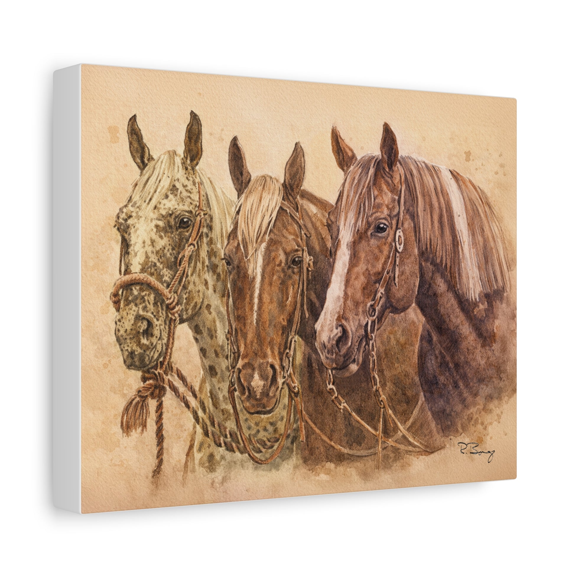 Three horses, sketched in honest pencil and warmed with loose watercolor, gather on a matte stretched canvas like old companions at dusk. Warm browns, rusts, and sun-faded golds drift across the surface, the paper’s texture showing through where the paint thins — a reminder of long rides, weathered tack, and quiet evenings on the ranch. The composition holds the original linework, so each ear, speckle, and blaze reads like a memory. It’s a calm, steady portrait of companionship and grit: no rush, just presence. Hung above a mantel or leaning on a shelf, this canvas brings a lived-in ranch feeling — the hush after chores, the coffee gone cold, and the sure company of animals that have shared the road with you.