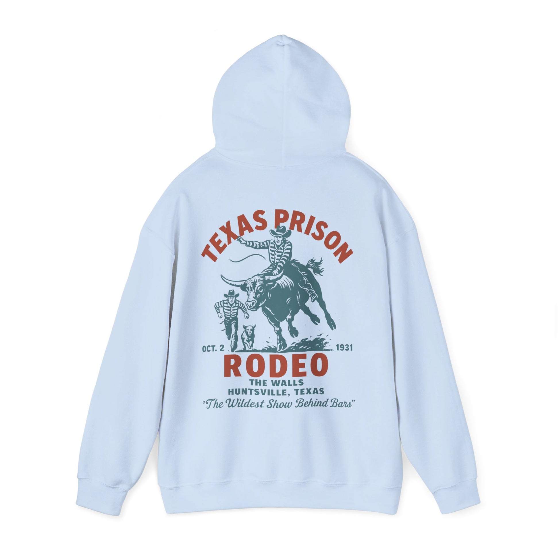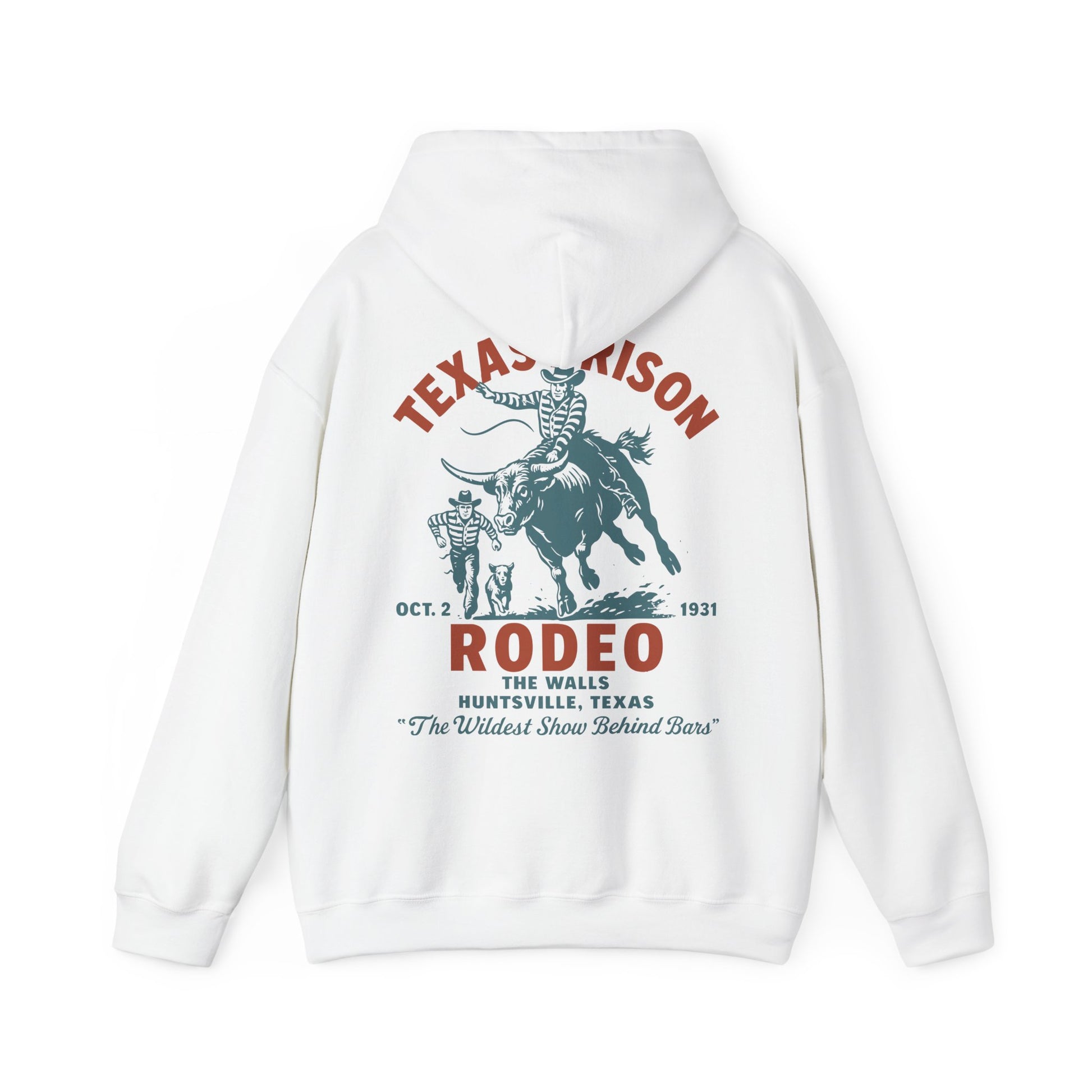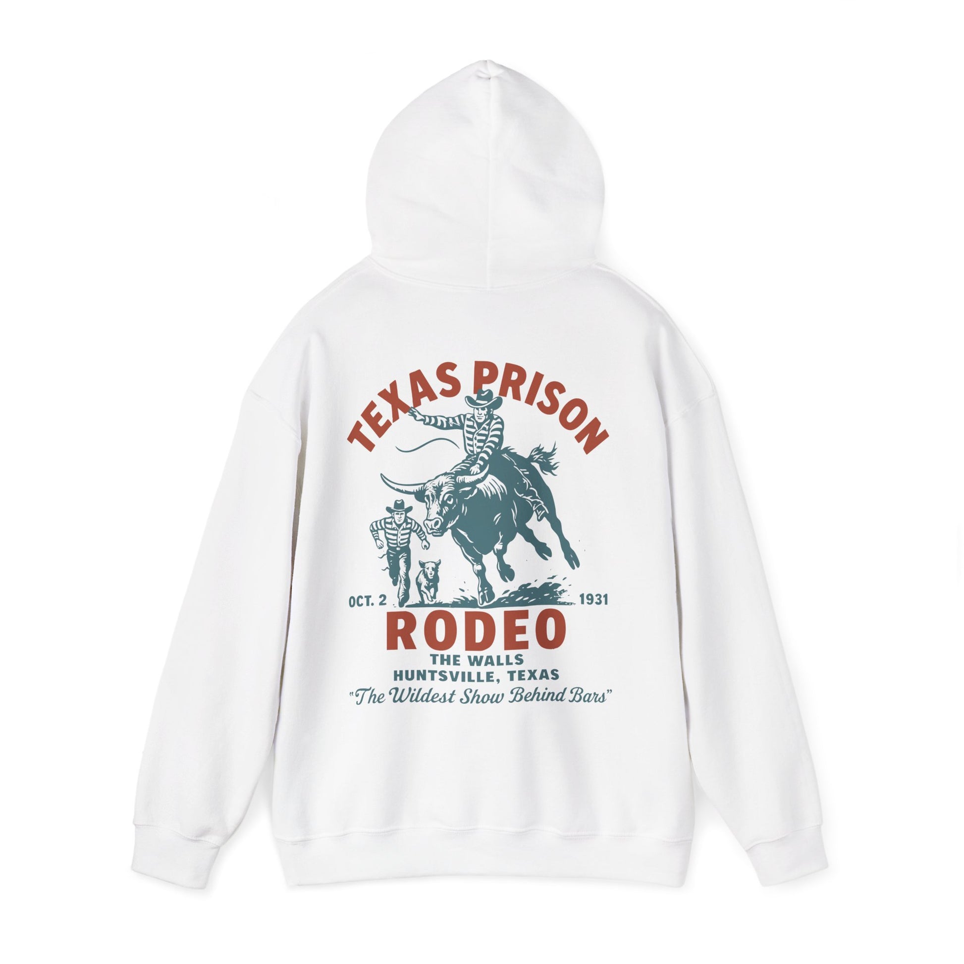 Step into the wild legend of the Texas Prison Rodeo with this vintage-style graphic Hoodie. Bold stripes, rough edges, and classic red-blue ink printed on a soft cotton garment. Perfect for those who appreciate the grit, guts, and gallows humor of Texas history. Wear it proud to the dancehall, stockyards, or while swapping stories on the porch. Ideal for rodeo enthusiasts, history buffs, and those who love vintage-inspired fashion.