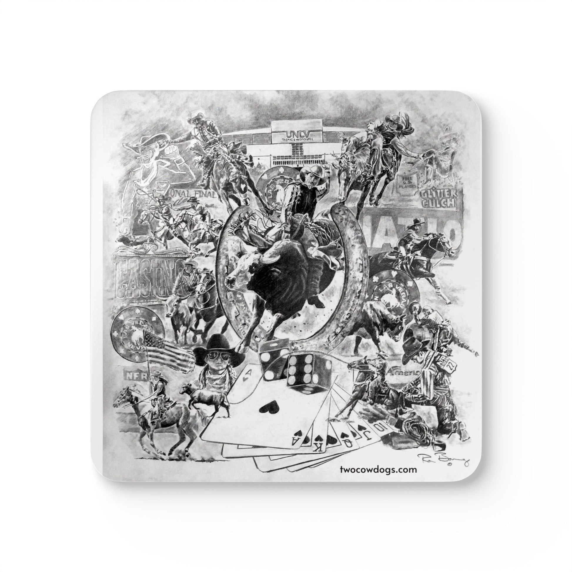 Packed with bull riders, broncs, cowdogs, jackpots, cards, dice, and the bright lights of Vegas, it’s a wild pencil-drawn collage straight out of the National Finals Rodeo. Every inch is buzzing with grit, dust, and rodeo chaos — all wrapped in that signature Two Cow Dogs hand-drawn style.