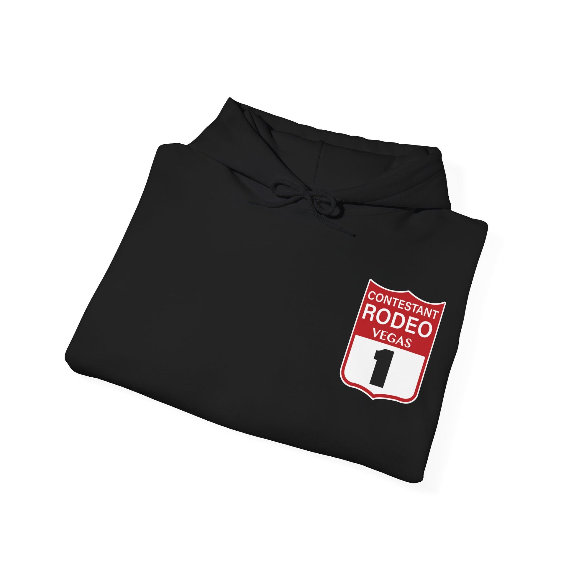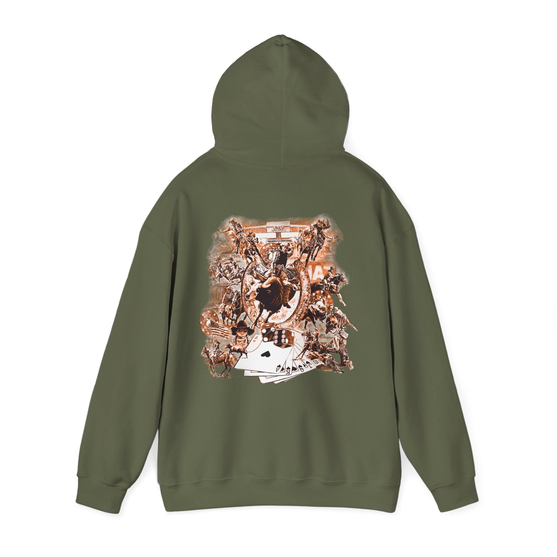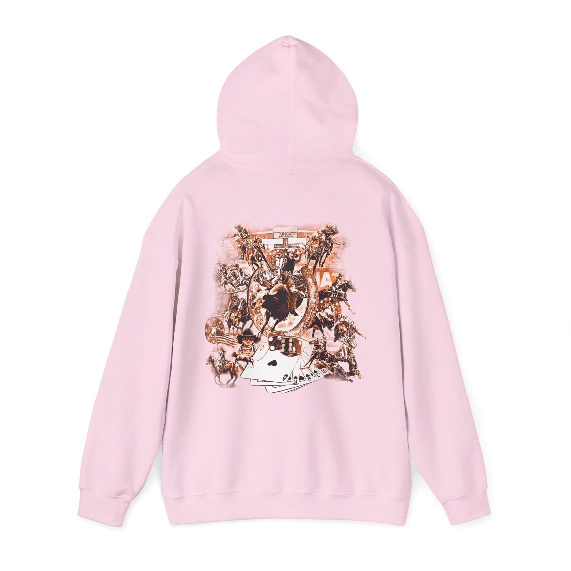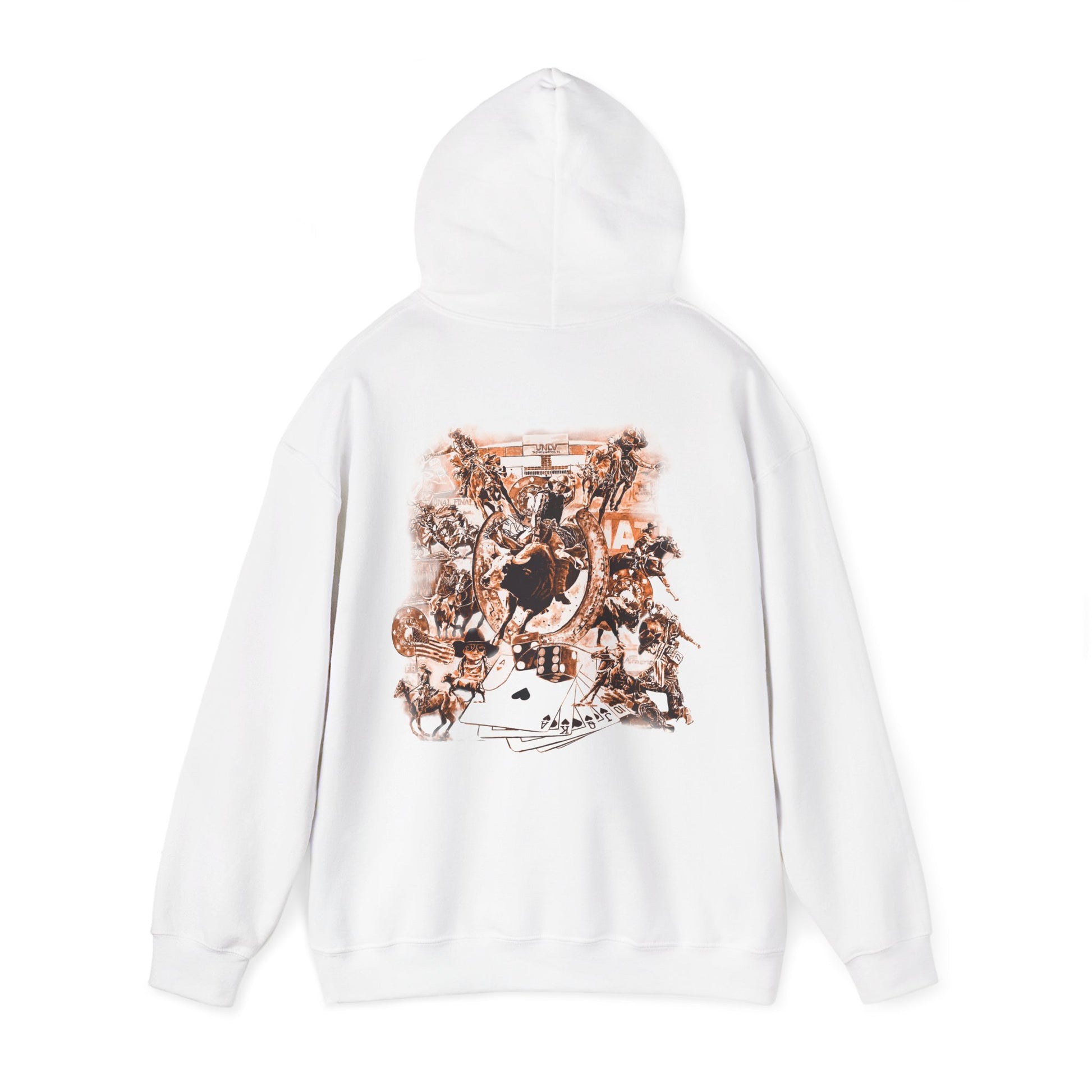 Introducing the Vegas Rodeo Heavy-Blend Hooded Sweatshirt, the perfect blend of quality and comfort. Featuring a rodeo backnumber on the front and original artwork printed on the back. This unisex heavy blend hooded sweatshirt is relaxation itself. Made with a thick blend of cotton and polyester, it feels plush, soft and warm, a perfect choice for any cold day. In the front, the spacious kangaroo pocket adds daily practicality while the hood's drawstring is the same color as the base sweater for extra style points.